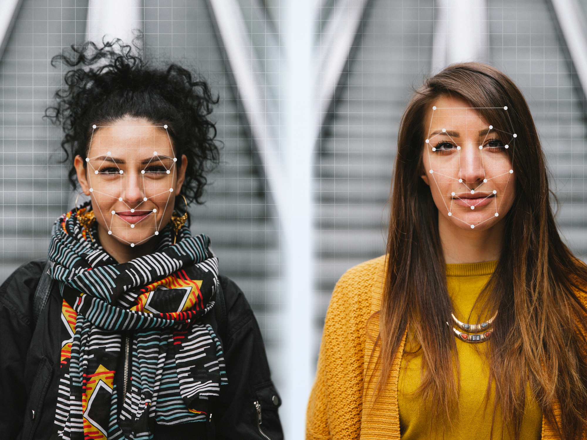 Image Description: Two young women standing in front of facial recognition AI.